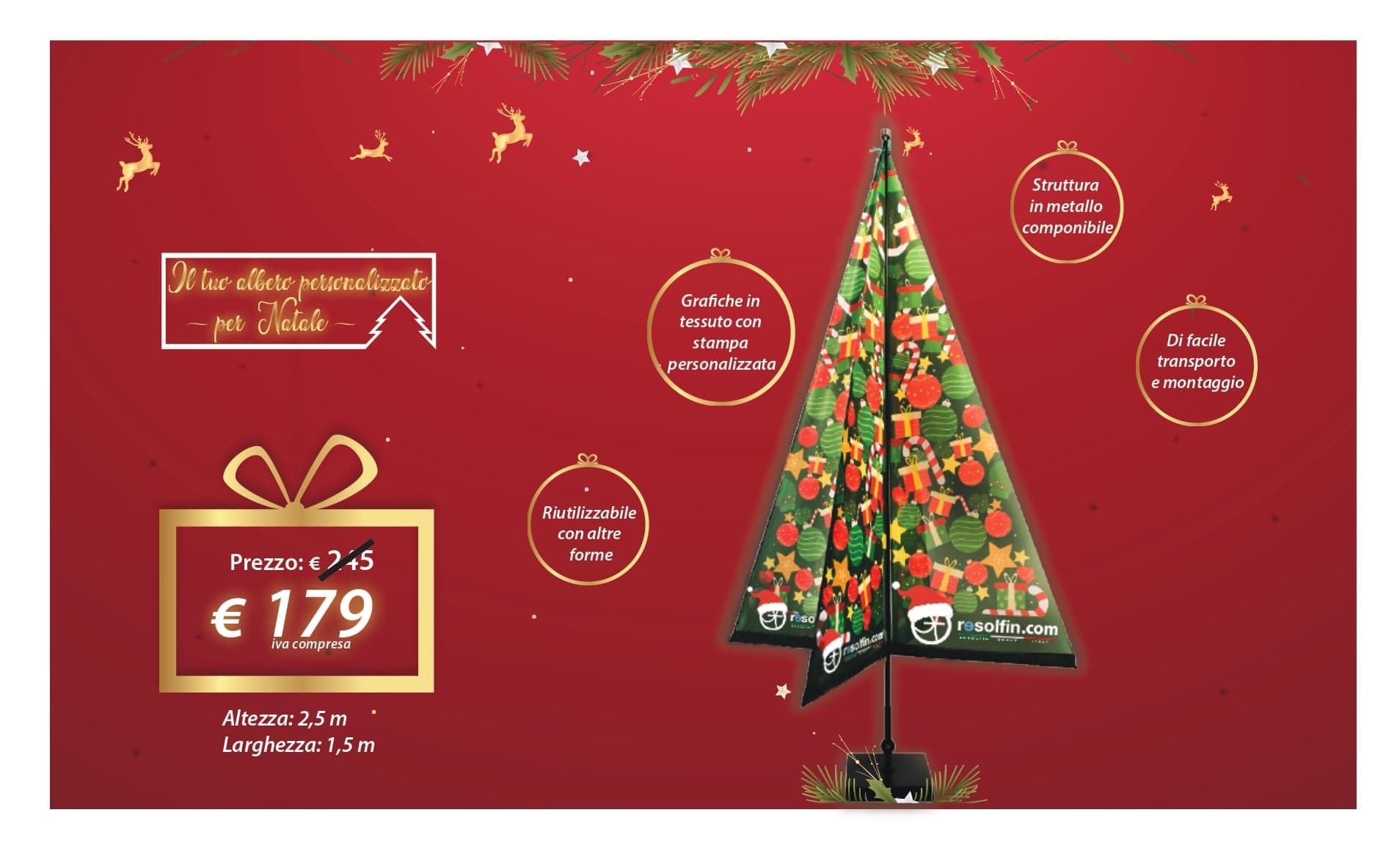 Albero di Natale totalmente personalizzabile in dimensioni, altezza, larghezza e grafica.